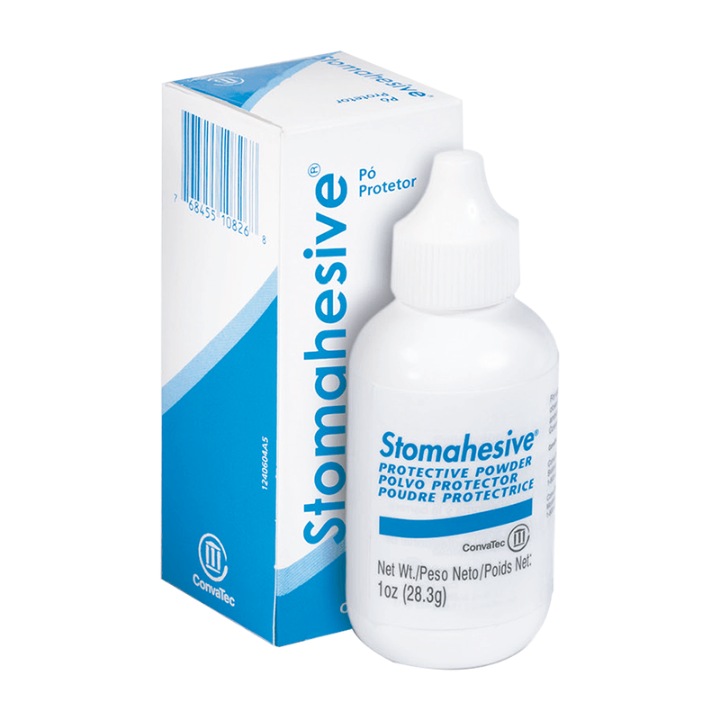 Stomahesive Pó Protetor de Pele é uma substância não-estéril, granular, higroscópica, muita fina que adere às áreas úmidas de modo a formar uma barreira que cobre e protege a pele contra irritações causadas pelos efluentes.